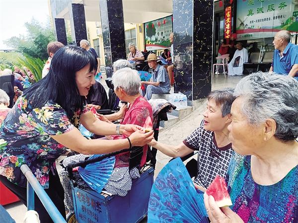 “来,吃块西瓜吧,解渴又消暑。”志愿者热情地为老人切西瓜吃。接过志愿者递来的西瓜,老人感到的是阵阵清凉,脸上露出了灿烂的笑容。