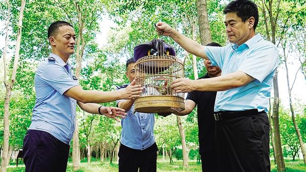 近日,在淮阳区梅园森林公园,随着淮阳区自然资源局工作人员打开一个个鸟笼,云雀、蜡嘴鸟、百灵鸟、画眉等近70只被救助的野生鸟迫不及待地飞出鸟笼,回归大自然。据悉,这是区自然资源局联合区委宣传部等部门,对区野生动物救助站救助和区森林警察大队侦办案件时查获的鸟类开展的一次放飞活动。 记者 侯俊豫 通讯员 杨正华 摄