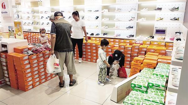 家长带着孩子选购鞋子。