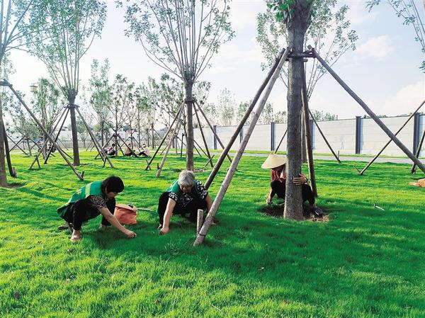 9月22日,几名园林养护人员在中心城区滨河公园一处绿地清除杂物。连日来,市城管局园林绿化中心组织工作人员在中心城区滨河公园开展清除干枯枝叶、杂草等工作,提升了公园整体环境面貌。记者 沈湛 摄