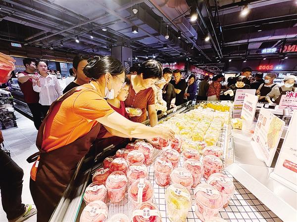 9月29日,记者来到万果园五一文化广场店,这里蔬菜、水果种类繁多,米、面、油、盐等一应俱全,吸引众多顾客前来选购。