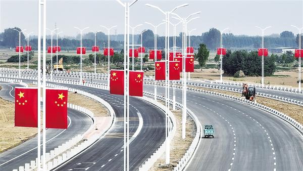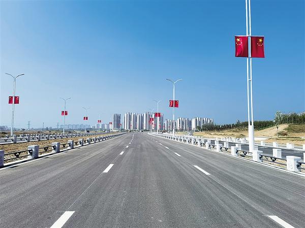 蜿蜒曲折的公路向前延伸,白色的路灯如影随形,简单的主体造型透露出婉约美。恰逢“十一”国庆节,项目施工方也十分应景地在路灯上悬挂国旗,庆祝新中国75周年华诞。