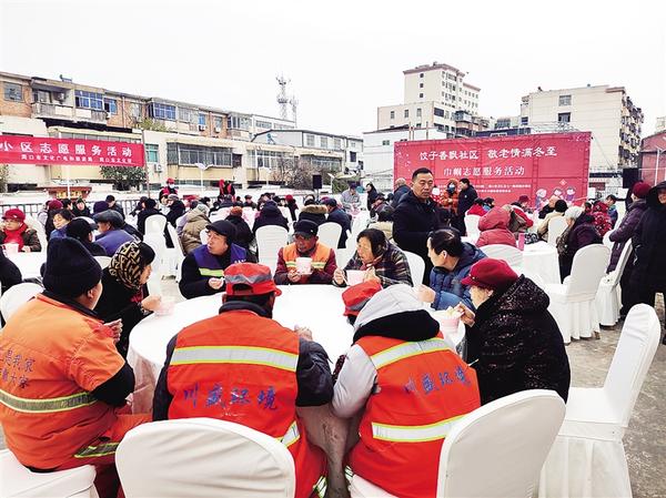 本报讯 为进一步弘扬民俗文化,大力弘扬“老吾老以及人之老”的中华民族传统美德,近日,川汇区七一路街道联合周口市妇联、周口市大铁牛巾帼志愿者联合会在新闻社区创卫馨苑小区开展“饺子香飘社区、敬老情满冬至”主题活动,为辖区老人送去热腾腾的饺子。