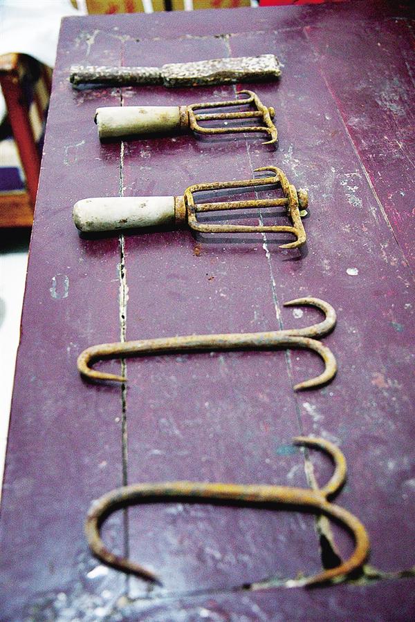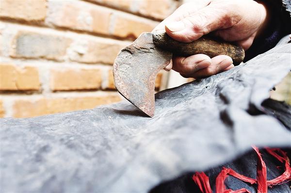 上世纪七八十年代,骡马仍是农田耕作的主力,所以皮鞭、皮绳的需求量很大。皮坊街上的老皮匠经常制作皮鞭、皮绳等,陆妞和弟弟陆凯强放学回家后还会搭把手。陆云久从乡下买来牛皮,处理掉皮上的毛,再捆扎在一起,弄到皮坊街的臭皮坑(皮坊泡皮子的坑,夏天腥臭无比)里浸泡,泡好后拉回家,用刀子刮掉皮上的油脂,然后再用小镰刀割成皮条,接下来拧成皮绳或皮鞭。