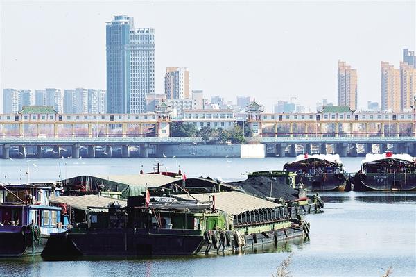 1月15日上午,多艘货船停泊在沙颍河周口大闸前,等待船闸开启。近年来,我市发挥沙颍河“黄金水道”优势,大力发展内河航运、做强临港经济,逐步成为中原地区对接长三角的桥头堡、对外开放的新高地。记者 梁照曾 摄