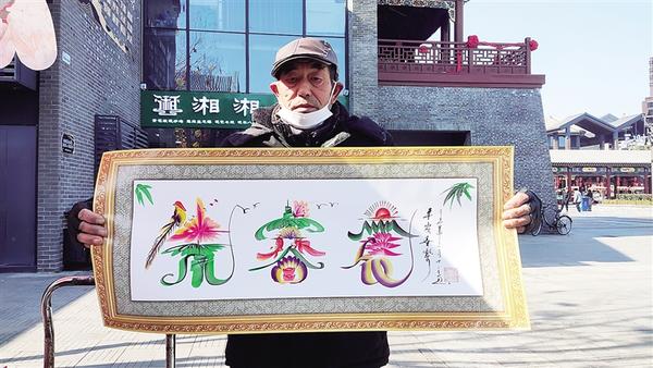 在今年的“三川十馆·春会”期间,我们总能在关帝庙文化广场看到一位花鸟字创作艺人。他手拿特制扁笔,用简洁线条勾勒出动植物、山水、建筑等图案来代替文字笔画。“真是妙笔生花!”“这是真功夫,字儿真漂亮!”“这是艺术大师的作品……”在众人的赞叹声中,一幅幅花鸟字作品一气呵成……