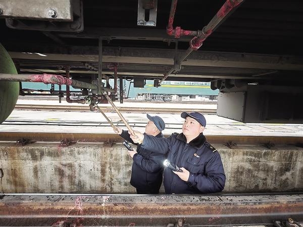 对列车进行认真检查,是罗凯林每天的“必修课”。从列车转向架、制动系统到车下悬吊系统,他带领技检班组成员,手持检车锤、技检摄像手电、掌上电脑,对入库列车逐节车厢、逐个部位细致查看。冰冷的金属器件在寒风中更添凉意,罗凯林目光专注,不放过任何一处细节。