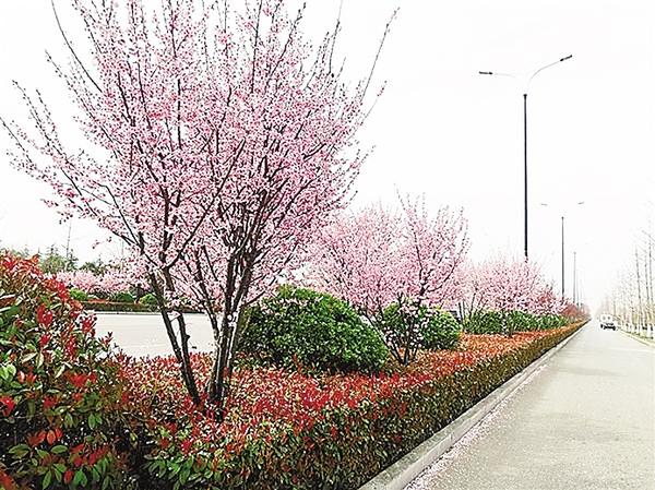 华旺大道两侧绿化带内,美人梅竞相绽放。