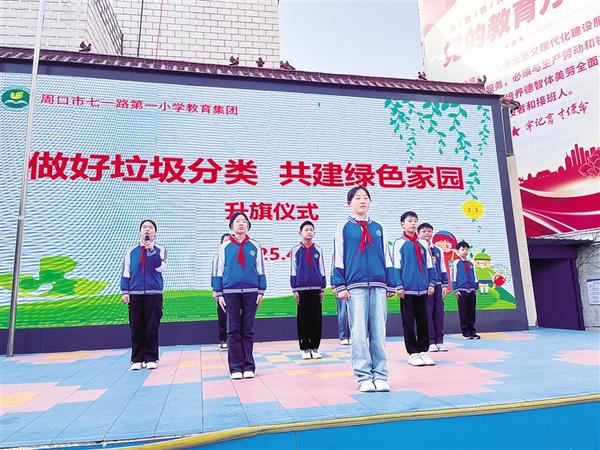 4月7日,周口市七一路一小全体师生齐聚操场,举行以“做好垃圾分类,共建绿色家园”为主题的升旗仪式。该校持续开展垃圾分类活动,将环保教育融入日常教学工作,引导师生养成良好的垃圾分类习惯,为打造绿色校园、美丽家园贡献力量。通讯员 张素芹 摄