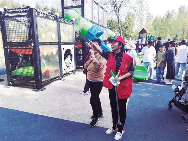 本报讯 清明假期,周口植物园迎来客流高峰。周口市大铁牛巾帼志愿者联合会的志愿者始终坚守岗位,为游客提供帮助与服务。