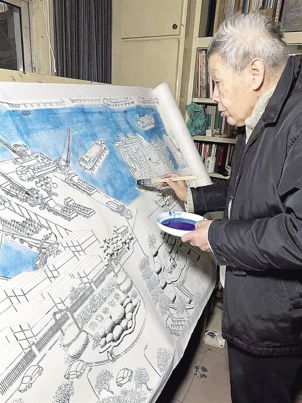 定下了目标,老葛的生活又充满了动力。每天上午,老葛在家伏案作画两三个小时,下午骑着三轮车到沙颍河边观景。他的车里常年装着照相机和速写本,遇见聊得来的人,就停车交流一阵儿。5年来,他走遍了中心城区沙颍河两岸,感受着人间烟火气息,观察着城市变迁。在他的精心描绘下,画卷一天天铺展,沙颍河的万千气象尽入其中。