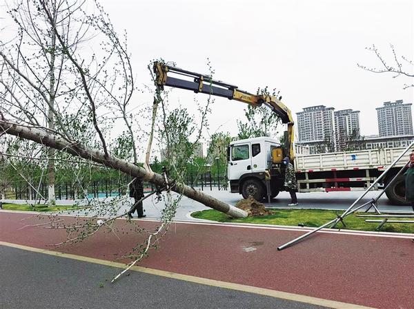 本报讯 4月11日夜,我市遭遇大风侵袭,城区部分行道树被吹倒、刮断。面对突发险情,市园林绿化中心迅速反应,第一时间启动应急预案。4月12日凌晨起,该中心组织人员对市区行道树受损情况展开“地毯式”排查,优先处置清理阻碍交通、砸到车辆的树木,并对受损行道树进行修剪、扶正、固定作业。