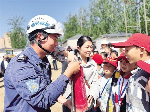曙光救援队队员为小记者讲解灭火器的使用方法。
