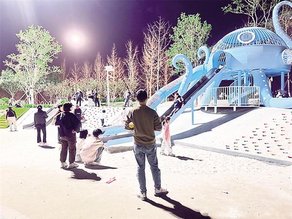 4月16日晚,市民在沙颍河畔一处儿童游乐区游玩。近年来,国家卫生健康委发起了“体重管理年”的号召,似一股东风唤醒全民的健康意识。眼下春意正浓,沙颍河两岸绿意盎然、生机勃勃,不少市民选择在下班后走出家门,沿着沙颍河两岸尽情享受篮球、羽毛球等运动带来的乐趣,构成了一幅动感十足的城市画卷。记者 杜营营 摄