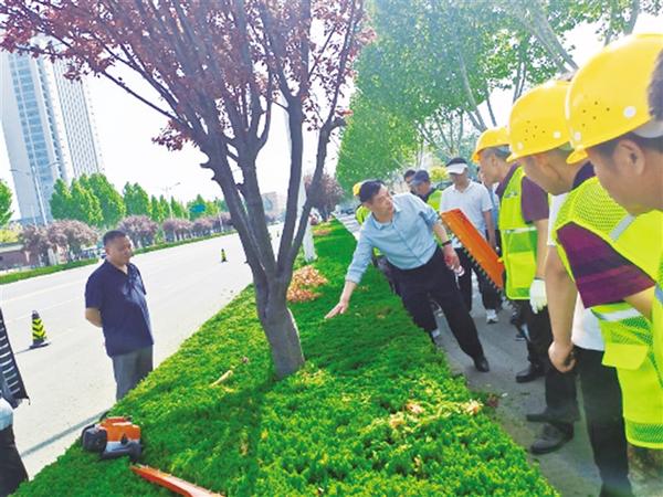 本报讯 为加强园林绿化技术交流,提升各县(市、区)园林绿化管养水平,4月18日,市园林绿化中心组织专业技术团队赴淮阳区开展园林绿化技术实操与专题培训,为当地绿化工作人员提供精准修剪、病虫害防治指导,推动绿化养护精细化、标准化、科学化发展。
