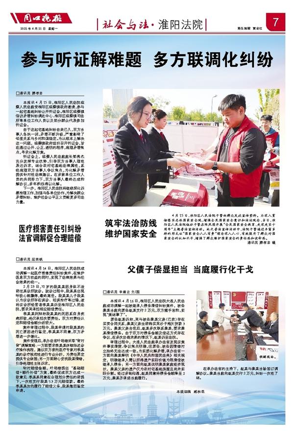 本报讯 4月16日,淮阳区人民法院大连人民法庭成功调解一起被继承人债务清偿纠纷案件,被告秦某当庭向原告赵某支付2万元,双方握手言和,实现“案结事了”。