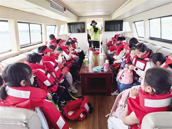 随后,小营员乘坐观光游艇,悠然航行于引黄调蓄湖上。周报研学的讲解员化身生态知识的传播者,用生动有趣的语言,向小营员介绍了引黄调蓄湖在防洪排涝、涵养水源、调节气候、净化空气和保护生物多样性等方面的重要作用。小营员听得入神,不时提出疑问,与讲解员积极互动,对生态环境保护的重要性有了更深刻的认识。午餐后,小营员乘坐小火车,环绕引黄调蓄湖游览。沿途湖光潋滟,美景如画,他们沉醉其中,对家乡的热爱之情油然而生。