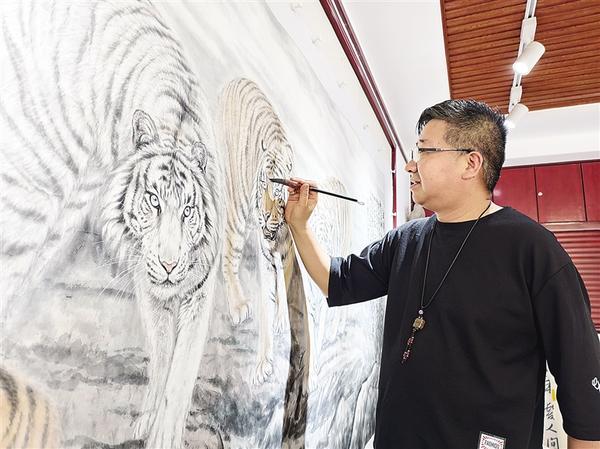 窦中亮近日从杭州寓所返回周口老家,筹备个人画展事宜,带回诸多作品,其中一幅丈二《五虎图》尤为震撼。画卷挂满一面墙,图中五只老虎或行或卧或跃,眼神犀利深邃,毛发细腻蓬松,似从山林深处走出,尽显磅礴力量。周口画家同行见之,莫不赞叹:“真乃虎虎生威也!”