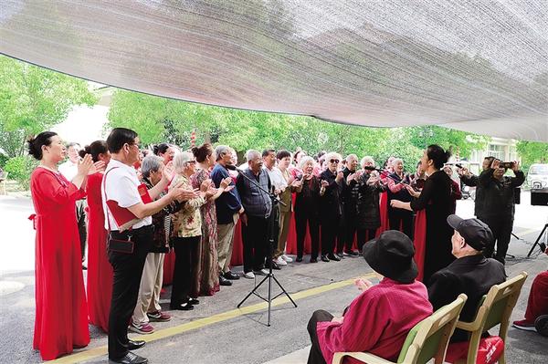 4月27日,周口市退伍军人合唱团到川汇区太昊路老年护理院慰问演出。合唱团成员与老人一起演唱《我的祖国》。通讯员 赵素霞 摄