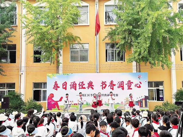 4 月 27 日,周口市李庄小学举行“春日诵经典,书香润童心”经典诵读比赛。全校师生齐聚操场,在一篇篇传世佳作的吟诵中,领略中华优秀传统文化的深厚底蕴与独特魅力,上演了一场经典诵读盛宴。学生不仅展示了自己的风采,而且在诵读中汲取经典文化的丰富养分,进一步增强了民族自豪感。通讯员 陈惠玲 摄