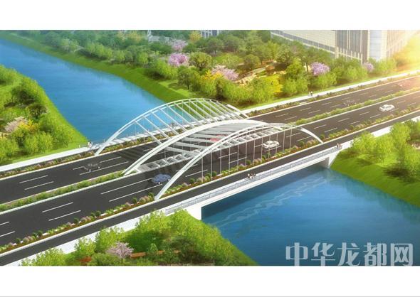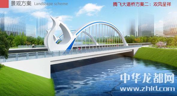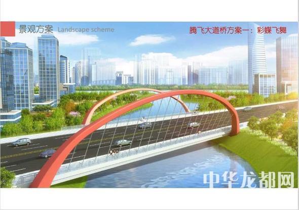 腾飞大道桥的设计方案有两套,分别为“彩蝶飞舞”和“双凤呈祥”。“彩蝶飞舞”为下承式钢管拱桥,宽36米。记者从效果图中看到,桥两侧的拱圈,极具色彩感,给人一种赏心悦目的感觉。“双凤呈祥”为装饰钢管拱桥,宽36米。该桥采用“双凤”造型,象征天下太平,富含吉祥之意。