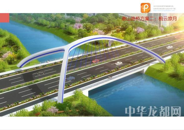 泰山路桥的设计方案有两套,分别为“铮铮铁骨”和“梳云掠月”。“铮铮铁骨”为下承式系杆拱桥。记者从效果图中看到,其拱体骨架给人一种力量感,拱身视线通透,简洁明快。“梳云掠月”为钢筋混凝土提篮拱桥。记者从效果图中看到,该桥的拱圈造型独特,简洁又不失大气。