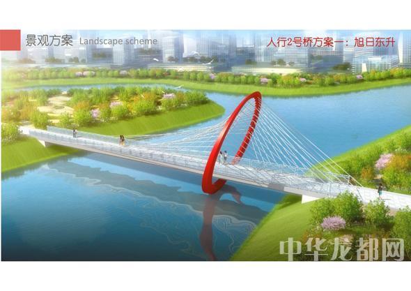 人行2号桥的设计方案有两套,分别为“旭日东升”和“气贯长虹”。“旭日东升”为圆形塔悬索桥。记者从效果图中看到,该桥的桥塔为圆形,犹如一轮东升的太阳,象征着城乡一体化示范区蓬勃发展的未来。“气贯长虹”为中承式系杆拱桥。该方案结合中国玉带桥的古典元素、抽象古典几何美学,采用现代的设计手法,创作出现代感和中国传统桥梁元素杂糅的桥梁设计。