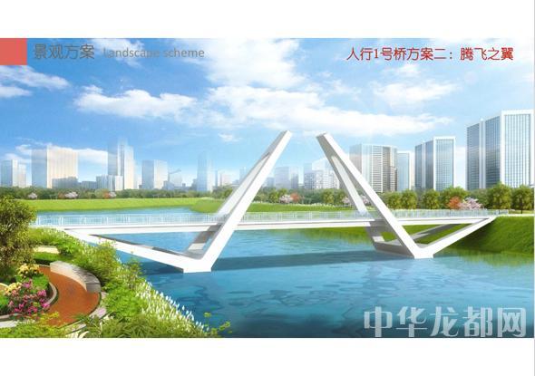 人行1号桥的设计方案有两套,分别为“飞龙在天”和“腾飞之翼”。“飞龙在天”为双塔斜拉桥。记者从效果图中看到,该桥呈现出优美的线条,宛如一条长龙腾空在天。“腾飞之翼”为V腿连续钢箱梁桥。记者从效果图中看到,桥体简洁流畅,时尚现代,桥墩形成稳固的三角形,像两只燕子展翅高飞。