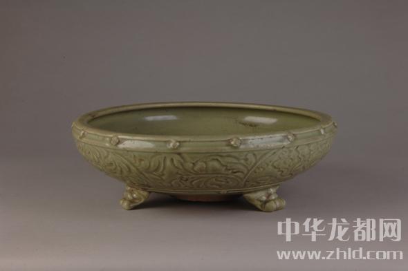 明龙泉窑“金玉满堂”刻花三足洗,1983年在淮阳出土,1984年公安部门在盗墓群众家中查获,后移交文物部门,现藏于周口市博物馆。该器物通高10.5厘米,口径27.6厘米。敛口折肩,圆唇平沿,斜腹微弧鼓。腹下附三兽面足,多侈、底部假圈足内凹。肩负施凸弦纹一周,沿、肩之间附16朵梅花。腹刻折枝牡丹花卉,腹下施两道凸旋纹,两旋纹之间附6朵梅花。豆青天釉不过底,内砂底,有十字形、间有“金玉满堂”四字。