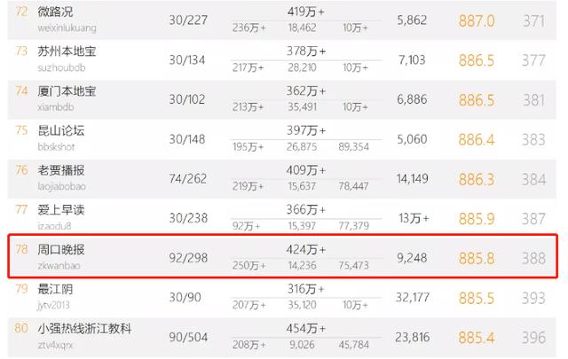 新榜坚持内容分类排行,内容包括民生、财富、科技、教育、文化、百科等类别,分析引入类别权重,尽可能呈现符合社会主流价值的中国500强生态面貌。周口晚报微信号一直稳居周口本地微信排名第一,在全省也是名列前茅,本次荣登新榜微信500强三连冠,显示了周口晚报微信公众号经得起专业、权威机构推敲,其传播价值得到了行业主体的认证。