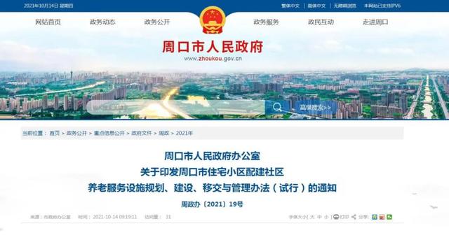 《周口市住宅小区配建社区养老服务设施规划、建设、移交与管理办法(试行)》已经市政府同意,现印发给你们,请结合实际,认真贯彻执行。