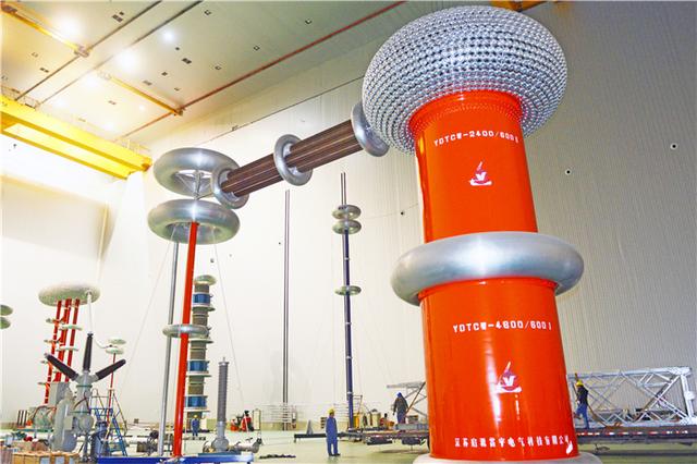 技术人员在河南省高压电器研究所有限公司特高压绝缘试验大厅内安装测试设备