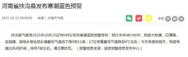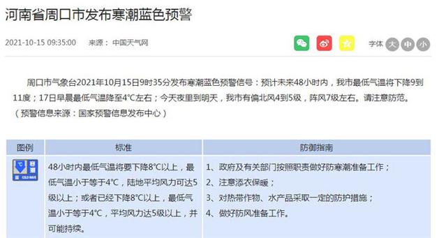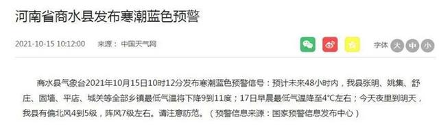 河南省气象台今日09时00分发布寒潮蓝色预警:预计未来48小时内,黄河以北和三门峡、洛阳、平顶山、漯河、许昌、郑州、开封、周口、商丘九地区及驻马店地区西部、南阳地区北部最低气温将下降8到11度;17日早晨,上述大部分地区最低气温将降至2到4度,高海拔山区可达0度左右。今天夜里到明天,全省大部分地区偏北风4到5级,阵风7级左右。请注意防范。