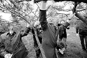 3月31日,日本第24次植树访华团成员在修剪该团首次来南京载种的千头松。当日,日本第24次悼念南京大屠杀遇难者植树访华团一行25人在侵华日军南京大屠杀遇难同胞纪念馆举行了悼念活动,并在纪念馆的和平公园内修剪他们24年来在纪念馆所植下的树木。为表达对中国人民的歉意,日本“绿色赎罪”植树访华团自1986年来24次来南京植树6万多棵。新华社发