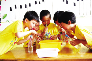 为培养幼儿对科学的兴趣和爱好,提高孩子的动手操作能力,近日,周口市第四幼儿园组织孩子开展了以科学探索为主的实践活动,让孩子们在实践中掌握知识。图为孩子们在精心做实验。(王敏 张杰 摄)