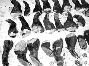 7日晚11时30分,在防城港森林公安局,记者见到了分装在8个白色泡沫箱中的熊掌,熊掌断口处还隐隐可见血痕。据警方介绍,原来包熊掌的纸张上,印有外文。