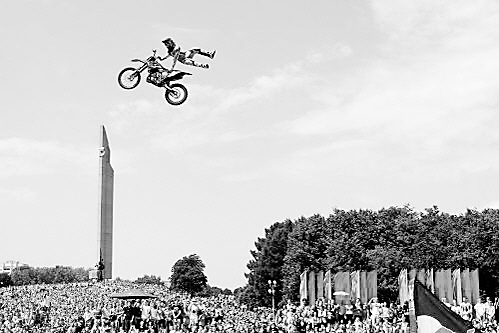 6月27日,一名摩托车手在明斯克广场进行飞跃特技表演。当日,在白俄罗斯明斯克举行了一场越野摩托车特技表演。 新华社/法新