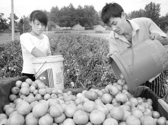 在“幸福家庭行动”中,商水县袁老乡积极引导农民摸准市场脉搏,发展高产高效经济作物,鼓起了农民的钱袋子。图为该乡二府村村民苏小平家种植的4亩西红柿喜获丰收,亩均收入3000余元。 (刘飞 摄)