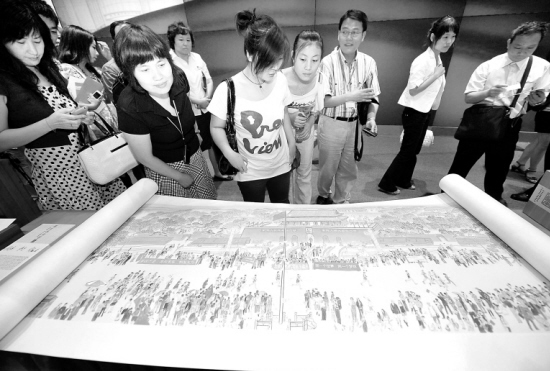 7月16日,观众在中华世纪坛欣赏《盛世长安图》原作。当日,由北京出版集团与广东新华发行集团共同组织创作的大型绘画长卷《盛世长安图》在北京中华世纪坛亮相。《盛世长安图》画卷全长40米,高0.6米,以新中国成立60周年为契机,将北京长安街及其延长线上有代表性的自然及建筑景观绘制成长卷,艺术地再现了长安街美景和百姓安居乐业的生活常态,被誉