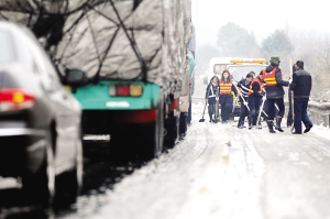 1月6日,路政工作人员在江西省境内的福银高速昌九段清扫冰雪。当日上午,江西省气象台发布道路结冰红色预警信号。 (新华社发)