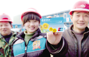 1月6日,农民工郭菊(中)展示领到的工资卡。2010年,安徽省将在全省范围内大力推行农民工工资卡,力争50%以上农民工的工资通过银行卡发放到农民工手中,避免因人为的现金操作造成拖欠农民工工资。(新华社发)
