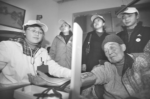 1月7日,贵阳市小河区的部分“绿丝带”志愿者开展“关爱未成年人”、“关爱空巢老人”等活动,以多种方式为未成年人、空巢老人及养老院老人提供帮助、送温暖。据悉,贵阳市的“绿丝带”志愿者行动开始于2008年初,数百名“有车族”在车窗系上“绿丝带”在冰雪中免费接送数千名群众。此后,绿丝带成为贵阳市志愿者的标志。( 新华社记者 欧东衢 摄)
