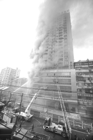 1月8日,消防官兵在灭火。当日9时28分左右,武汉汉正街利济南路25号硚房大厦发生火灾,经过67台消防车、200余名消防官兵的5个小时紧张扑救,位于全国著名小商品集散地武汉汉正街的硚房大厦大火终于被扑灭。周围商铺的商品交易和生活秩序也已逐渐恢复正常。