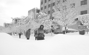 1月7日,新疆富蕴县城居民在积雪的街头行走。连日来,新疆北部阿勒泰地区遭暴雪袭击。持续降雪降温对当地农牧民的生产生活造成严重影响,阿勒泰通往各县市客车已全部停运。