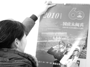 昨日,一位女士在悬挂国庆阅兵挂历。据了解,今年挂历新增了好多创意,可以说是集观赏、实用、娱乐于一体,其中以国庆阅兵为题材的挂历很是热销。好多市民说,国庆阅兵挂历不但好看,还有收藏价值。