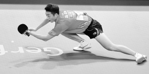 1月10日,许昕在比赛中救球。当日,在中国澳门塔石体育馆举行的国际乒联2009职业巡回赛总决赛男子单打半决赛中,中国选手许昕以4比2战胜队友王励勤,晋级决赛。