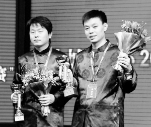 1月10日,广东棋手许银川(右)和湖北棋手洪智在领奖台上。当日,在2009年中国象棋年终总决赛三番棋决赛第三局比赛中,许银川战胜洪智,以2比1的总比分夺得冠军。