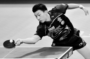 1月10日,马龙在比赛中回球。当日,在中国澳门塔石体育馆举行的国际乒联2009职业巡回赛总决赛男子单打半决赛中,中国选手马龙以4比2战胜队友张继科,晋级决赛。 新华社记者 卢炳辉 摄