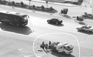②商贩在快车道旁推销产品。