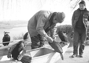 昨日,在沙河周口段,一位渔民带着自己的6只鸬鹚准备下水捕鱼。据了解,随着生态环境的恶化,环境承受能力和生态资源的不断下降,使用这种传统捕鱼方式的渔民越来越少。记者 沈湛 摄
